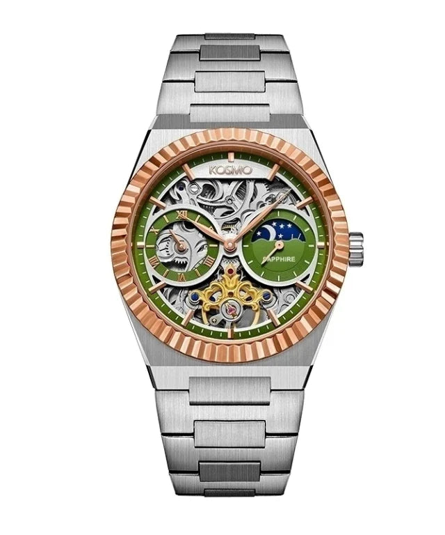 Un diseño tipo skeleton que permite ver el movimiento automático en acción. Ideal para quienes aprecian la mecánica de un reloj sin sacrificar estilo. Detalles en rose gold, cristal zafiro y caja de acero 316L lo convierten en una pieza de lujo accesible.