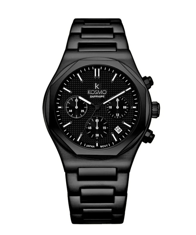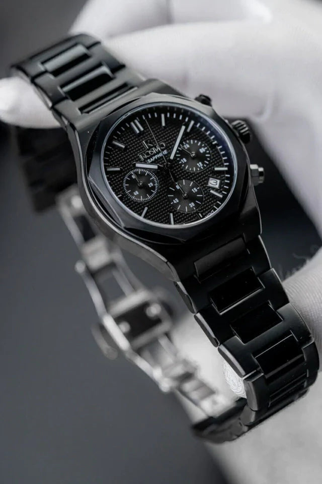 Diseño deportivo y elegante con un perfil completamente negro. El Kosmo 646-7 destaca por su estructura en acero inoxidable 316L y su resistente cristal zafiro. Su función cronógrafo lo convierte en una pieza funcional y moderna para uso diario o eventos especiales.