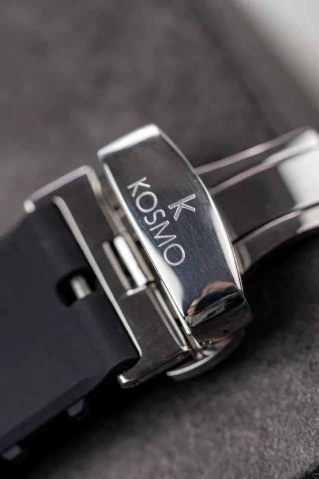 El reloj Kosmo es resistente al agua hasta 5ATM, lo que significa que es adecuado para su uso en actividades acuáticas superficiales como nadar en piscinas o en la playa. Su logotipo grabado en la parte trasera de la caja y hebilla le da un toque único y exclusivo.